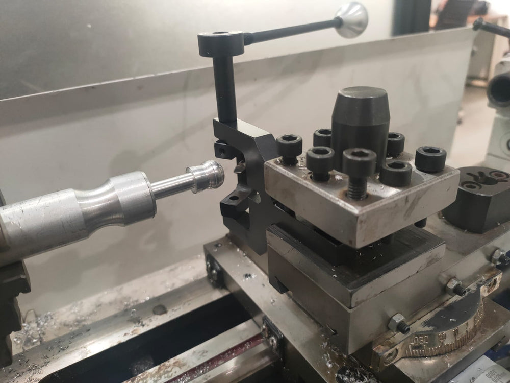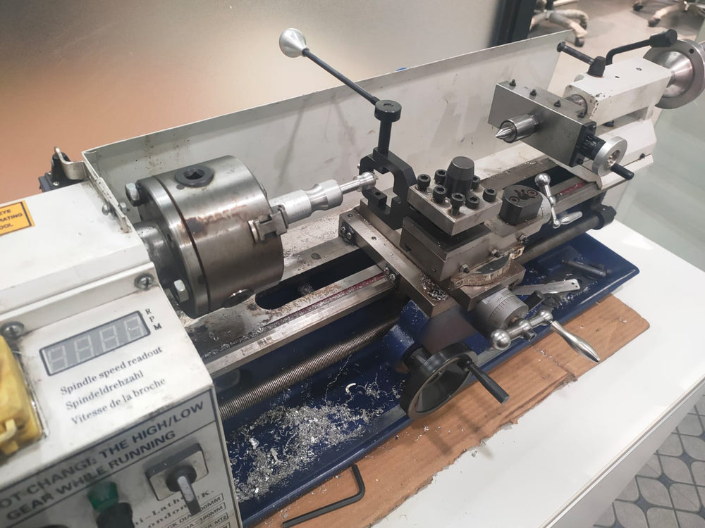 - Lathe Setup: Small metal lathe shown in operation. Chuck holding an aluminum workpiece. Tool post securing the radius turning tool in position.