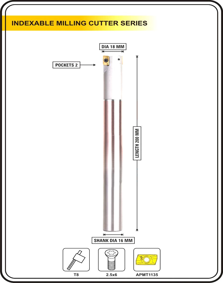 This is a precision-engineered Shoulder and Face Milling Cutter used in both CNC and Manual Milling Machines. Compatible with ISO APMT1135 carbide inserts, it ensures cost-effective and efficient machining compared to traditional HSS tools. The cutter body is hardened to 45–50 HRC, offering excellent wear resistance and long tool life.