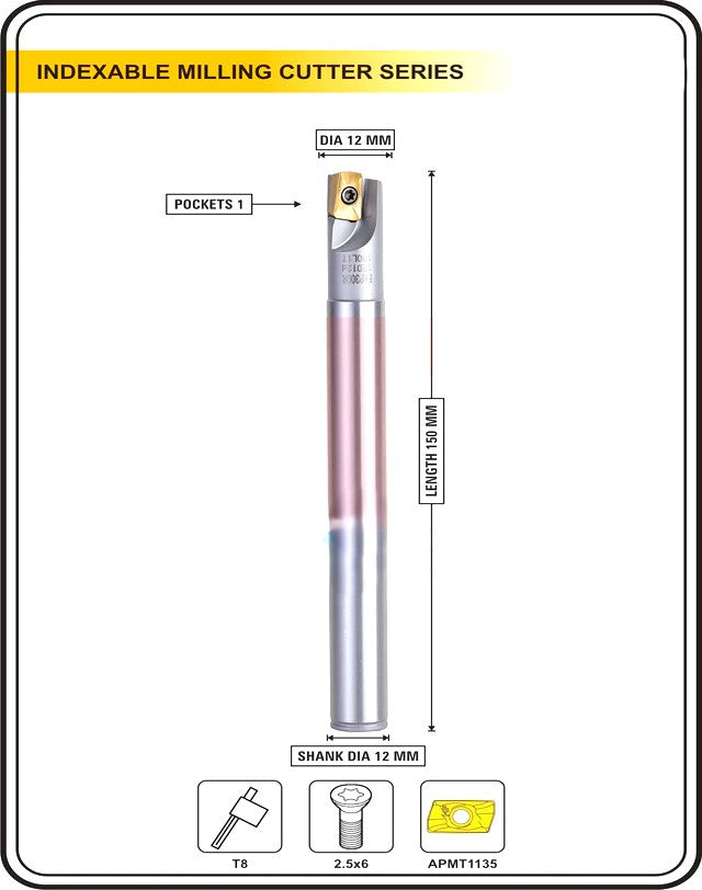 This is a precision-engineered Shoulder and Face Milling Cutter used in both CNC and Manual Milling Machines. Compatible with ISO APMT1135 carbide inserts, it ensures cost-effective and efficient machining compared to traditional HSS tools. The cutter body is hardened to 45–50 HRC, offering excellent wear resistance and long tool life.