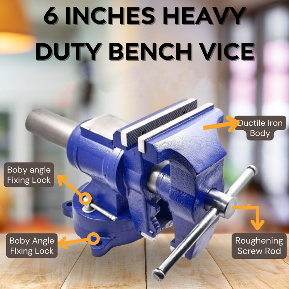 A 6-inch rotating bench vise is the ideal industry heavy-duty vise that prevents water, dirt & rust. It features with swivel head and base and can be used for home craftsmen, in the workshop, and even can be outdoor used. If the vise can be normally operated, it will be lifetime use.